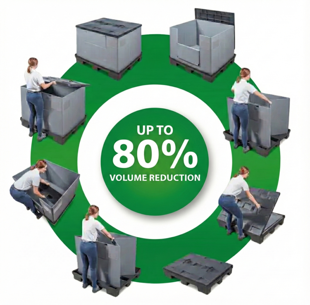 • “Sandwich” Folding System: The containers are collapsible and stackable, offering significant space savings when empty by reducing volume up to 80%. This ensures a high empty transport return rate, minimizing costs.